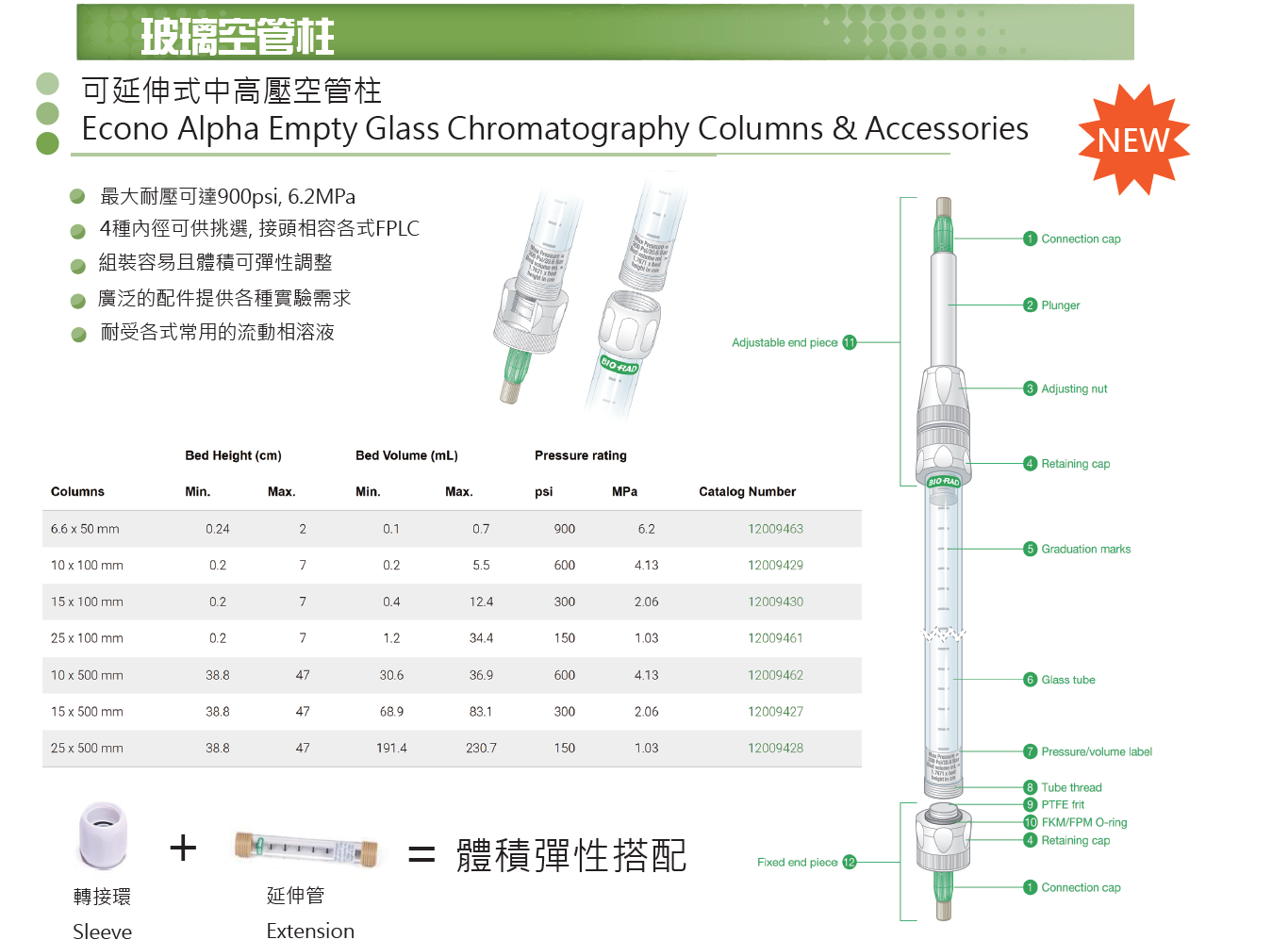 Econo Alpha 色譜管柱是我們全新推出的適用於低壓至中壓層析的空柱硬體系列。這些色譜柱使用方便,易於包裝,並與 NGC 系統和其他色譜系統相容。全組裝色譜柱提供多種尺寸,以滿足您的應用需求。