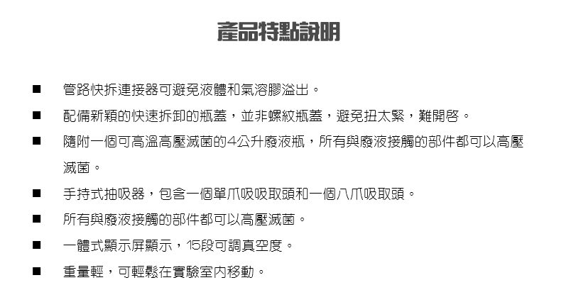 Whitley AsPROvac 可調式真空抽吸器也提供了一系列吸取頭,如八爪吸取頭,使您能夠從各種容器中或是培養盤中抽吸液體。此外還具備了新穎的快速拆卸的瓶蓋,與一個可高溫高壓滅菌的4公升廢液瓶,操作方便、安全。