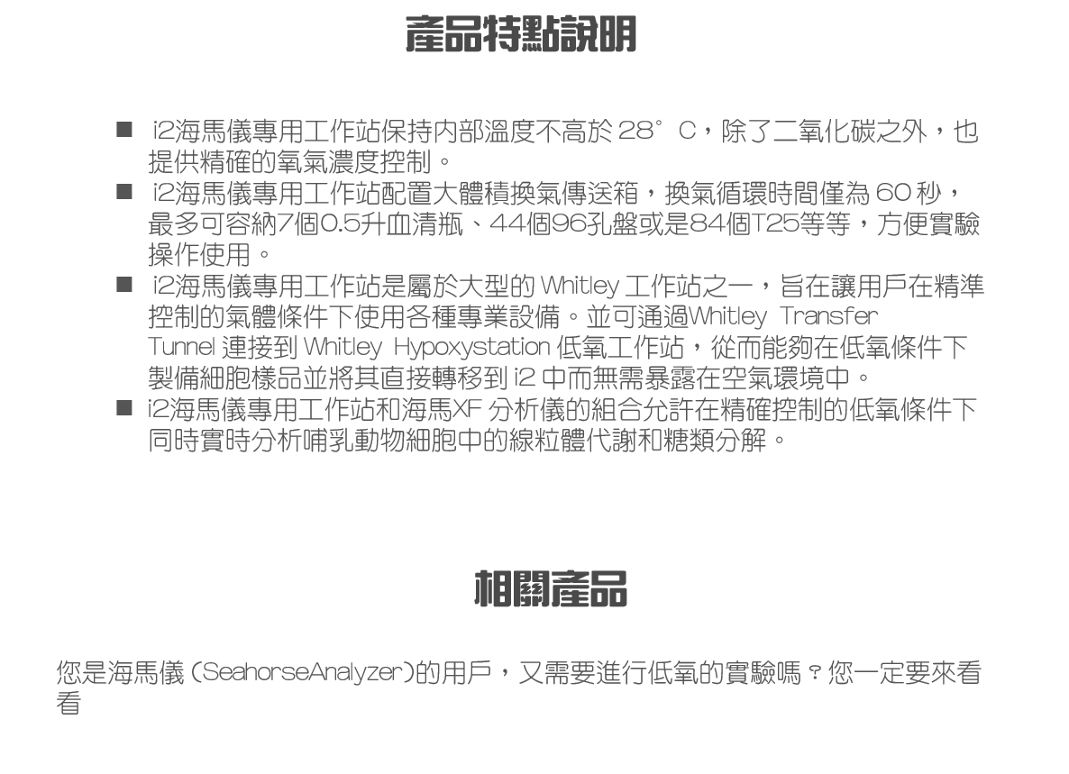 Whitley i2海馬儀專用工作站的開發是為了響應越來越多研究人員的想法,他們希望在低氧條件下使用海馬XF分析儀。因此 Don Whitley Scientific 原廠專門開發了一種新的培養工作站來滿足海馬分析儀精確的實驗要求。
