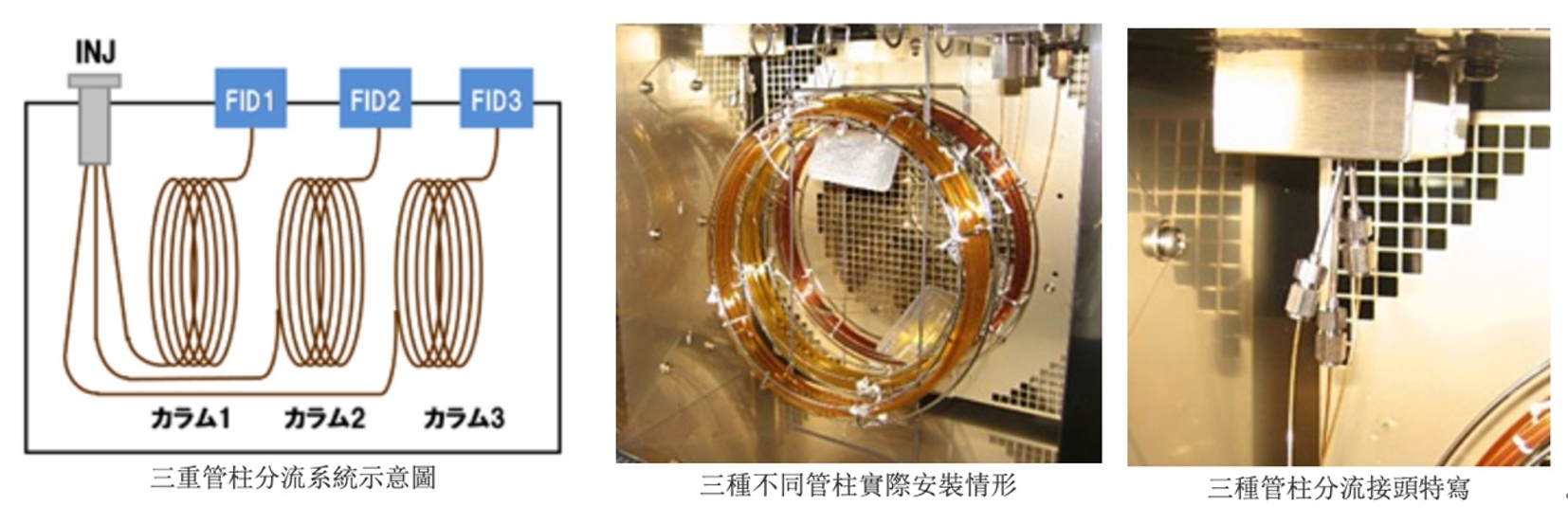 在開發GC分析方法時,若沒有公告方法或參考文獻,往往需要不斷重複實驗,並且更換管柱以取決使用哪一種極性管柱最適合分析。此時,GC-2014的三重管柱分流系統是最適合用於方法開發的工具。您可以同時以最多3種不同極性管柱同時進行分析,並且由3個不同的偵測器同時偵測並比較分析結果,不再需要不斷拆裝管柱且省下3倍的時間,讓使用者進行方法開發時的負擔更加減輕。