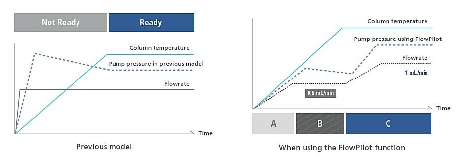 幫浦的突然啟動和停止或極端的梯度變化可能會損壞 HPLC 分析管柱。FlowPilot(智能流量控制)自動將流量逐漸增加到設定點,無需為每次分析反覆設定啟動。如下圖例,幫浦根據管柱烘箱(ovan)溫度控制流速。流量逐漸增加到設定值的一半(A階段)。流量保持恆定(B階段),直到管柱烘箱到達管柱的運作溫度,流量才逐漸增加到流速的設定值(C階段),以避免未達管柱工作溫度時,設定的流速將造成過大的壓力,導致管柱壽命減短。