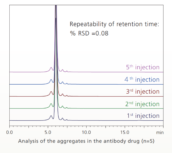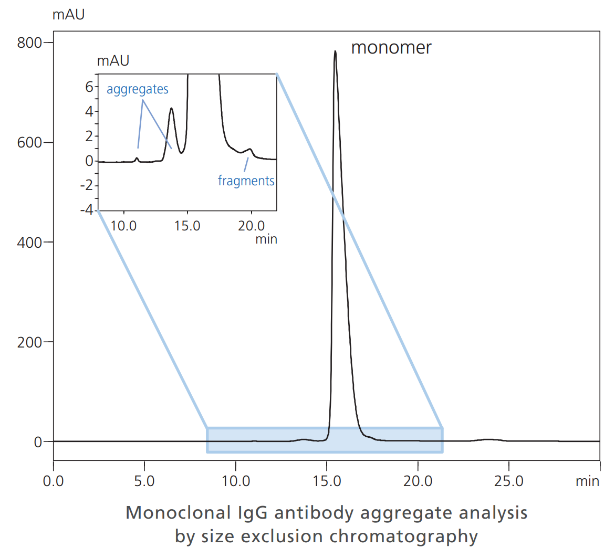 Aggregation test是抗體藥物製造時最關鍵的品質評估項目之一,抗體藥物的aggregation將導致純化效率和產量下降,也意味者產品的品質不佳,並可能人體的免疫反應。然而由於HPLC分析過程中含高濃度鹽類的流動相,例如氯化鈉,會腐蝕系統管路,此外蛋白質在管路金屬表面的吸附經常導致層析效能降低。