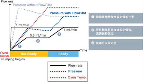 此外Nexera lite inert系統也俱備FlowPilot智慧流速控制功能。HPLC 的管柱可能因為增加差異過大的流速設定值,而產生急遽壓力而損壞。Nexera系列的 FlowPilot智慧流速控制功能可依據流速設定值與管柱恆溫箱溫度設定,些微調整流速,就如同經驗老練的使用者一般,分析人員也不再需要坐在儀器前慢慢調整流速與等待。